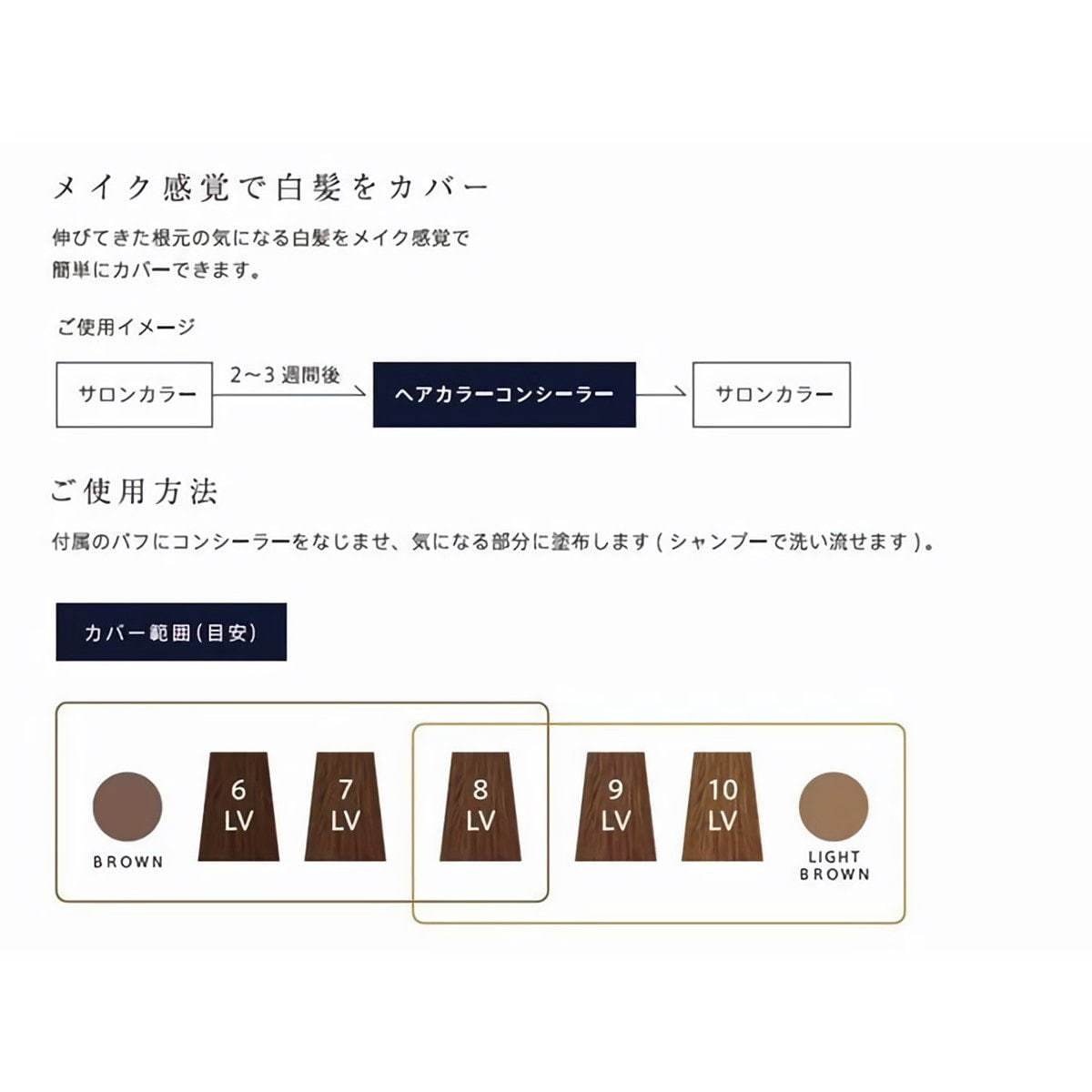 ヘアカラーをしてから数週間後くらいから気になりだす、顔周りや分け目の伸びてきた白髪を、簡単にカバーできる白髪用コンシーラー。自然な仕上がりで、ベタつきも気にならず、シャンプーで簡単に洗い流すことができます。まるでファンデーションのように、メイク感覚で忙しい朝や急なお出かけの際にも気軽にご使用いただけるので、次回のヘアカラーまで快適に過ごすことができます。
